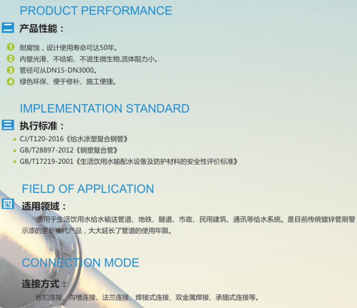 给水涂塑复合钢管,以直缝焊管为基管,它具有优良的综合性能和很强的耐腐蚀性,使用外界温度为-40℃-90摄氏度,适用输水温度为30℃-80℃.给水涂塑钢管在耐化学稳定性和卫生性能方面表现优越,完全符合生活饮用水输配水设备及防护材料的安全性评价标准。